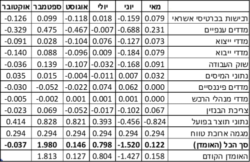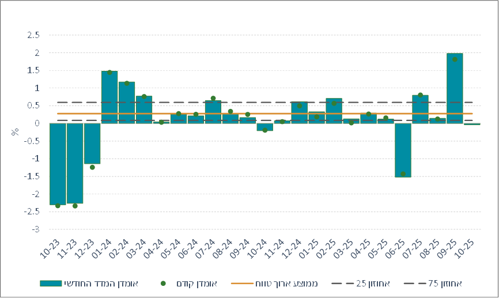 ظلّ المؤشر الشهري للنشاط الاقتصادي[1] في تشرين أول دون تغيير يُذكر، بعد ارتفاعه الحاد في الشهر السابق بعد انتهاء عملية "الأسد الصاعد" (الشكل 1). يعكس المؤشر لهذا الشهر متوسط تقديرات النمو الشهري للأشهر الثلاثة من آب إلى تشرين الأول. تأثر المؤشر سلباً بانخفاض المشتريات ببطاقات الائتمان خاصة في آب وتشرين أول، وانخفاض صادرات السلع في قطاع التكنولوجيا المختلطة خلال شهري آب وأيلول، وانخفاض صادرات الخدمات الأخرى خلال آب، وانخفاض واردات السلع خلال شهري آب وتشرين أول، وانخفاض إيرادات التجارة والخدمات والإنتاج الصناعي لمدخلات البناء والتكنولوجيا المختلطة خلال آب، وانخفاض بيانات سوق العمل المتعلقة بمدفوعات الأجور الحقيقية خلال آب، واستهلاك البنزين في أيلول. من ناحية أخرى، خففت بيانات الضرائب غير المباشرة وضريبة الدخل لشهر أيلول، والناتج المحلي الإجمالي الفعلي للربع الثالث من العام، من انخفاض المؤشر (الجداول 1 و2).