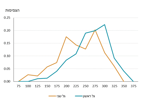 يستند التحليل إلى بيانات من جولتين من مسوحات PIAAC لمهارات البالغين أجريت عالمياً وفي إسرائيل في السنوات 2022-2023، وكذلك في العقد السابق. يخلص التحليل إلى أن مستوى المهارات الأساسية للعاملين الشباب في القطاع العام في إسرائيل قد انخفض في العقد الماضي، وخاصة بين الرجال الشباب. في عام 2022 كان مستوى مهارات الشباب في القطاع العام أقل بكثير من مستوى مهارات العاملين ذوي الخصائص المماثلة (العمر والتعليم وغيرها) في قطاع الأعمال، بينما لم تكن هناك فجوات واضحة في العقد السابق. في المقابل، لم يطرأ انخفاض في متوسط المهارات النسبية بين العاملين عموماً في القطاع العام، أي ليس الشباب فقط، ولم يطرأ سوى انخفاض بسيط في المهارات النسبية بين العاملات الشابات، وهو انخفاض غير ذي دلالة إحصائية. يشير تحليل توزيع مهارات العاملين الشباب (الشكل 1) إلى تحول نحو مستويات مهارات أقل، وخصوصاً إنخفاض كبير في نسبة الشباب ذوي المهارات العالية جداً في القطاع العام (325+ درجة). لم يتم العثور على انخفاض مماثل بين الموظفين في قطاع الأعمال.