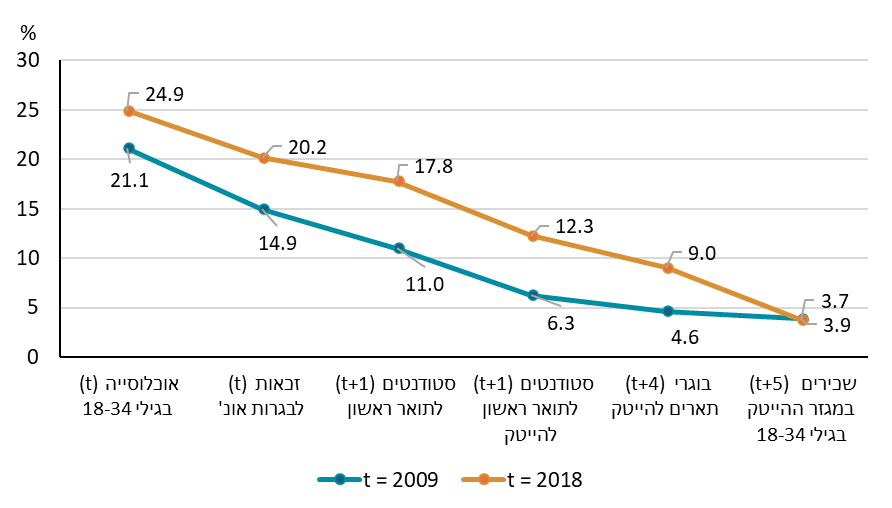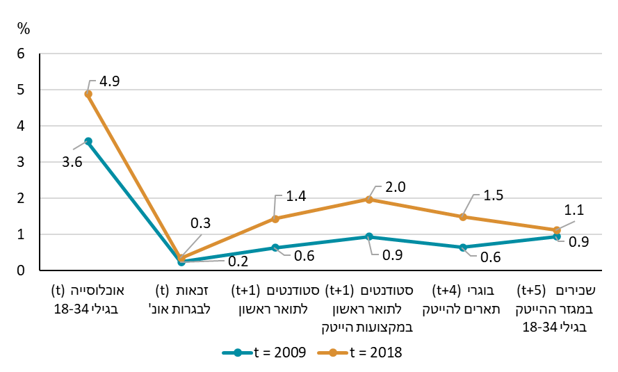 ملاحظات: يُمثل الحرف "t" السنة التي بدأت فيها المجموعة قيد الدراسة مسار الاندماج في التكنولوجيا الفائقة. في مرحلة الالتحاق بالجامعة، يتم فحص تمثيل العرب بين جميع طلاب الصف الثاني عشر في تلك السنة الأولية (t)، وكذلك تمثيلهم بين جميع الشباب (من 18 إلى 34 عاماً). يُفحص التمثيل في المرحلة الجامعية الأولى في السنة التي تلي انهاء الدراسة الثانوية (t+1)، بافتراض عدم التحاق هذه المجموعة بالجيش. يُفحص التمثيل في مرحلة أنهاء شهادة التكنولوجيا الفائقة بعد ثلاث سنوات من بدء الدراسة (t+4)، وأخيراً، يُفحص التمثيل في سوق العمل في السنة التي تلي التخرج (t+5). للاطلاع على تعريف قطاع التكنولوجيا الفائقة، انظر الملاحظة الهامشية رقم 2. المصدر: لوحة معلومات وزارة العمل "الأكاديميون من مختلف الفئات السكانية في مجال التكنولوجيا الفائقة"، والبيانات الإحصائية واستطلاعات اليد العاملة التي أجرتها دائرة الإحصاء المركزية، وتحليلات الباحثين. |