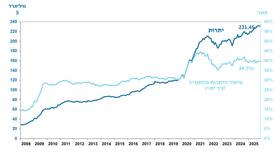 بلغ احتياطي النقد الأجنبي في نهاية شهر تشرين ثاني 2025 ما قيمته 231,425 مليون دولار، بانخفاض قدره 529 مليون دولار مقارنة بنهاية الشهر الماضي. وبلغ مستوى الاحتياطي بالنسبة للناتج المحلي الإجمالي 39.7 في المائة (الشكل 1).