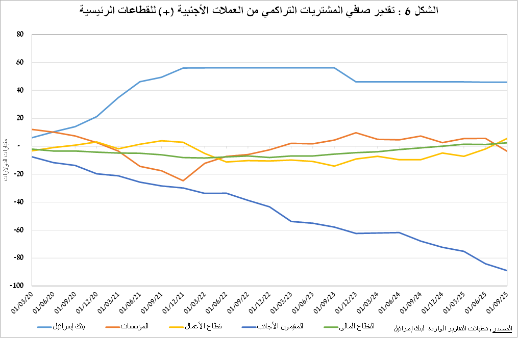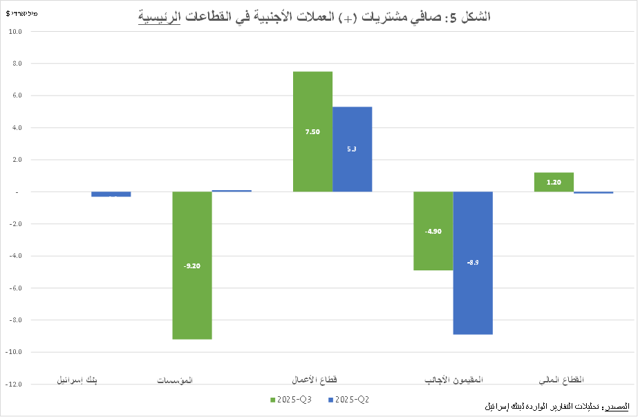 يشير تقدير نشاط القطاعات الرئيسية في سوق الصرف الأجنبي إلى نشاط غير متجانس للقطاعات الرئيسية: في الربع الثالث، تم تسجيل مبيعات صافية من النقد الأجنبي من قبل المقيمين الأجانب والهيئات المؤسساتية، مما دعم ارتفاع قيمة الشيكل، مقارنة بمشتريات النقد الأجنبي من قبل قطاع الأعمال.