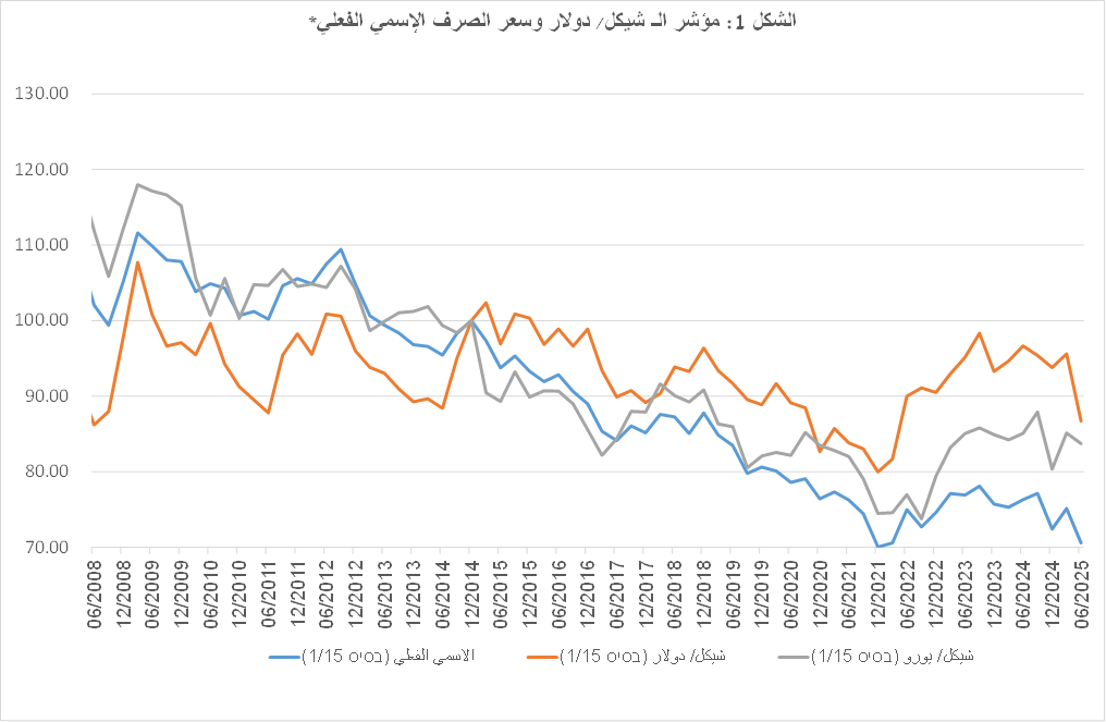 خلال الربع الثالث من عام 2025، ارتفعت قيمة الشيكل مقابل الدولار بنحو 2.0%، ومقابل اليورو بنحو 1.9%، حيث ساهم وقف إطلاق النار في غزة في انخفاض علاوة المخاطرة لإسرائيل. كما ارتفع الشيكل مقابل عملات شركاء إسرائيل التجاريين الرئيسيين بنسبة 2.6%، وفقاً لمؤشر سعر الصرف الفعلي الاسمي.