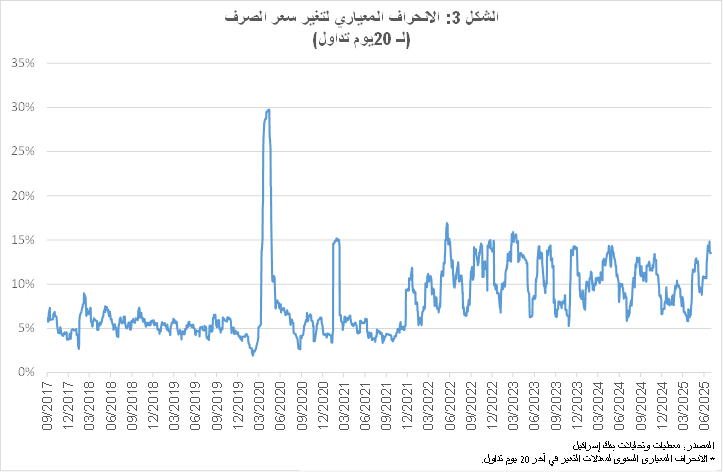 انخفض الانحراف المعياري الضمني لخيارات سعر صرف الشيكل/الدولار خارج البورصة - الذي يُشير إلى التقلب المتوقع في سعر الصرف - بمقدار 0.5 نقطة مئوية ليصل إلى متوسط 9.3%. يُضاف هذا إلى متوسط مستوى الانحراف المعياري الضمني لخيارات الصرف الأجنبي في الأسواق الناشئة، والذي انخفض بمقدار 1.5 نقطة مئوية ليصل إلى 9.6% بنهاية الربع.