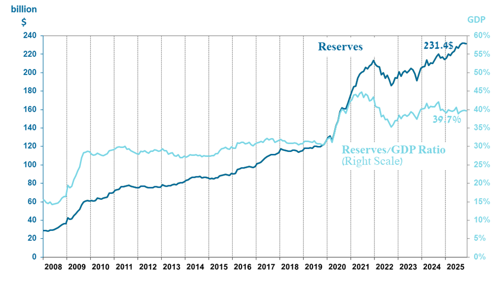 Level of foreign exchange reserves, and their ratio to GDP, 2008–2025