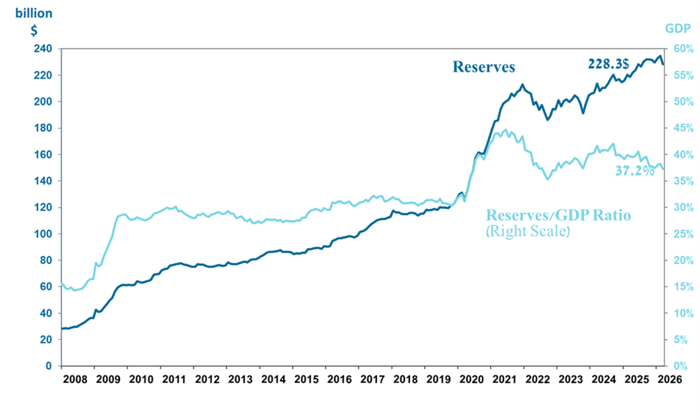 Level of foreign exchange reserves, and their ratio to GDP, 2008–2026