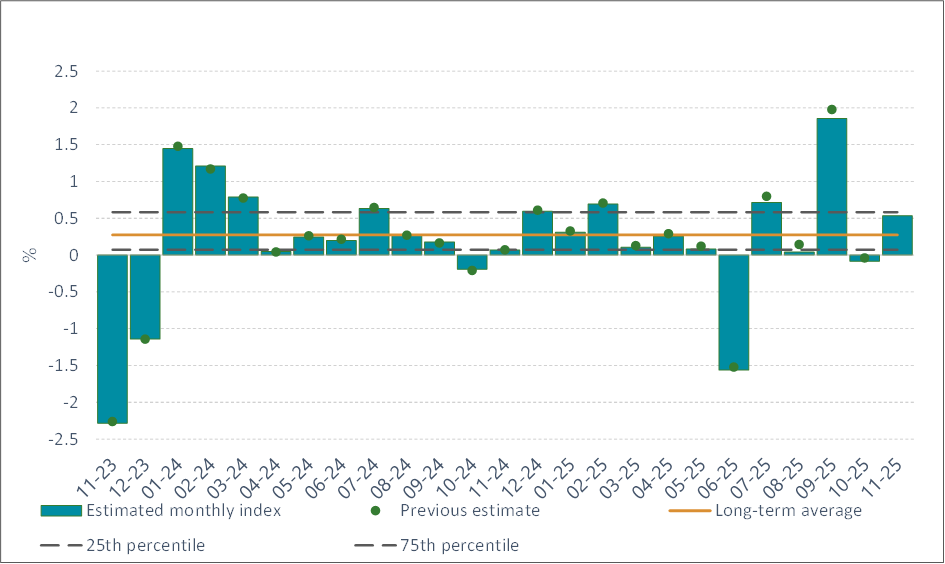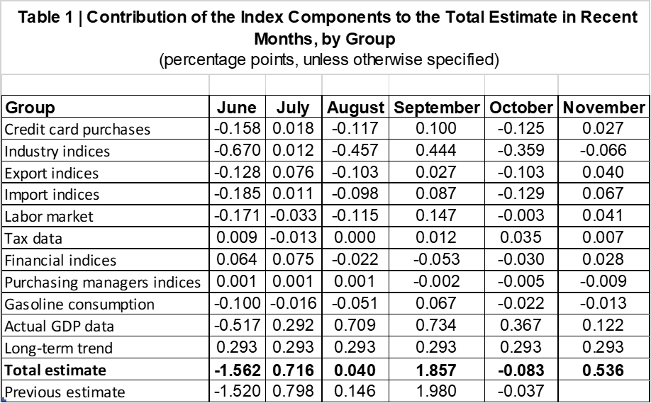 The monthly Index of Economic Activity[1] was increased by 0.5 percent in November, following a slight decline in October. The index this month reflects the average monthly growth estimate from September to November. The Index was positively influenced by data on goods exports in September to November, imports of consumption goods and production inputs in November, labor market data regarding the number of workers, wages, and job vacancies in September and October, indirect taxes in October and November, and the Tel Aviv Stock Exchange stock index and the Nasdaq index in September to November. The second estimate of actual GDP in the third quarter, which was published this week, also contributed to the increase in the index. In contrast, revenue data in the trade and services industries, industrial production data in mixed-high technology and in construction inputs, and gasoline consumption data in September moderated the increase in the index (Tables 1 and 2).
