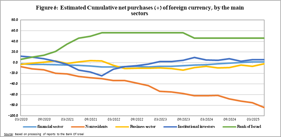 An estimate of activity by the main segments in the foreign exchange market indicates heterogeneous activity. In the third quarter, there were net foreign exchange sales by nonresidents and institutional investors, which supported the strengthening of the shekel, and foreign exchange purchases by the business sector. Institutional investors—pension funds, provident funds, and insurance companies—made a change in their activities. After moderate purchases in the previous quarter, totaling about $0.1 billion, they made net sales of foreign exchange totaling about $9.2 billion in the third quarter. Nonresidents continued to sell foreign exchange, but at a lower volume: about $4.9 billion in the third quarter, compared to about $8.9 billion in the second quarter. The business sector was prominent on the purchasing side, with a significant increase to about $7.5 billion, mainly due to an increase in net purchases by import firms and more moderate sales by export firms than in the previous quarter.