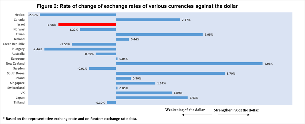 In the third quarter of 2025, the shekel strengthened by approximately 2.0 percent vis-à-vis the US dollar and by 1.9 percent vis-à-vis the euro, in view of the ceasefire in Gaza, which contributed to a decline in Israel’s risk premium. In addition, the shekel strengthened by 2.6 percent against the currencies of Israel's main trading partners, in terms of the nominal effective exchange rate (i.e., the trade-weighted average shekel exchange rate against those currencies).