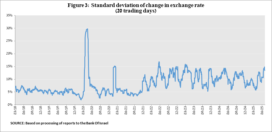 The average standard deviation of changes in the shekel/dollar exchange rate, which represents its actual volatility, declined by 1.7 percentage points during the quarter, to an average level of 9.4 percent.