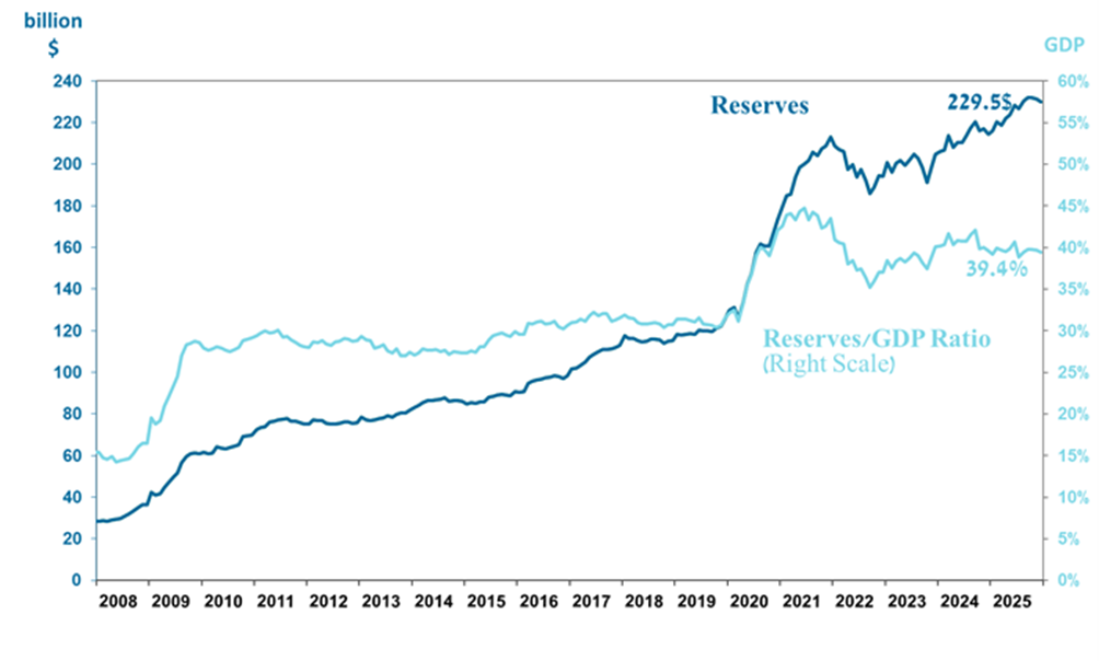 Israel’s foreign exchange reserves at the end of December 2025 stood at $229,484 million, a decline of $1,941 million from their level at the end of the previous month. The level of the reserves relative to GDP was 39.4 percent (Figure 1).