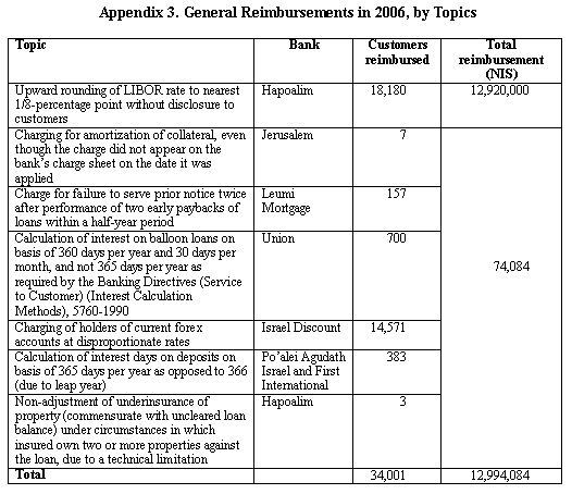 The information that reached the Banking Supervision Department in the course of its handling of enquiries from the public, as well as information from other sources, established a basis for system-level treatment of many issues in 2006, including matters related to early payback of loans, calculation of interest, and application of bank charges. Due to the treatment of these matters, the banks were required, among other things, to make NIS 13 million in reimbursements to customers—largely by Bank Hapoalim on account of upward rounding of the LIBOR rate to the nearest one-eighth percentage point without due disclosure to customers. |