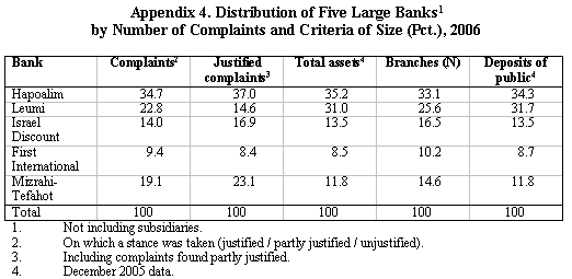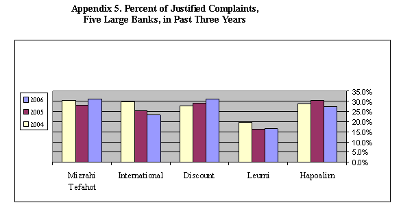 | Of the complaints on which the Department took a stance in 2006, 25.1% were found to be justified or partly justified. Among the five large banks, Mizrahi-Tefahot Bank had the highest share of complaints that were found to be justified in 2006 (31.1% vs. 27.9% in 2005), followed by Israel Discount Bank (31% vs. 29% in 2005), Bank Hapoalim (27.4% vs. 30.3% in 2005), and First International Bank (23.1% vs. 25.4% in 2005). Bank Leumi had the smallest proportion of justified complaints, at 16.5% (as against 16.1% in 2005). |