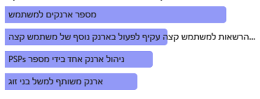 למשתתפים הוצגו ארבע פונקציונליות שונות: 1. מספר ארנקים למשתמש – בעוד שבעולמות התשלומים הקיימים אין מגבלות על מספר החשבונות או הכרטיסים שמשתמש יכול להחזיק, בשק"ד, מתן אפשרות למשתמש להחזיק מספר ארנקים אצל מספר PSPs כמתואר במסמך האיפיון, יצריך את המערכת לסכום את החזקות המשתמש על פני כל הארנקים כדי לאכוף את מגבלות ההחזקה; 2. ניהול ארנק אחד בידי מספר PSPs – יכולת זו אינה קיימת באמצעי התשלום המוכרים. היתרון הוא שהמשתמש מחזיק ארנק אחד ולא צריך לחלק את הנזילות למספר ארנקים, אך בוחר אילו פעולות כל PSP יכול לבצע בארנק ומקיים תחרות בין ה-PSPs על הפעילות בארנק. מורכבות שעלולה להיווצר היא הקושי לעקוב אחר פעולות – לדוגמה, משתמש שמעוניין לברר על תשלום מסוים יצטרך לדעת לאיזה PSP ספציפי עליו לפנות. בנוסף, יכולת זו עלולה להיות קשה להבנה עבור המשתמשים; 3. הרשאות למשתמש קצה עקיף לפעול בארנק נוסף של משתמש קצה אחר (למשל – לילדים בארנקי הוריהם, או ליחידות עסקיות של חברה מסוימת בארנק של החברה); 4. ארנק משותף - למשל לבני זוג.