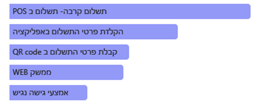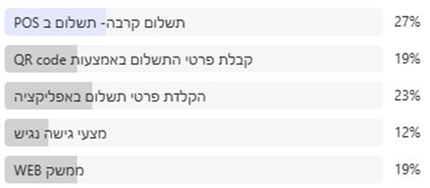 בשאלון הוצגו מספר אפשרויות: 1. תשלום ב-POS בטכנולוגיות קרבה בבית העסק (הארנקים הדיגיטליים שמאפשרים תשלום ללא מגע ) ; 2. הקלדת פרטי התשלום באפליקציה ; 3. קבלת פרטי התשלום באמצעות QR code שבית העסק יספק. יתרון של האפשרות הזו לעומת תשלום הקרבה, הוא האקטיביות של המשתמש בעת התשלום. 4. אמצעי גישה נגיש – מעין כרטיס קטן שעל גבו צג קטן ומקלדת. בשונה מכרטיס פשוט, הלוקח יוכל לראות את יתרתו. חיסרון של אמצעי זה הוא עלות גבוהה – משיח עם חברות טכנולוגיות עולה כי עלות לכרטיס אחד היא בין 50-100$ ; 5. ממשק WEB – ביצוע תשלומים דרך אתר. החיסרון הוא הקושי לוודא את זהות המשתמש בהשוואה לאפליקציה בטלפון נייד או אביזר פיזי אחר.