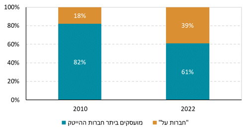 איור 2: שיעור המועסקים במגזר ההייטק ב"חברות על"1 לעומת יתר החברות, 2010 לעומת 2022 |