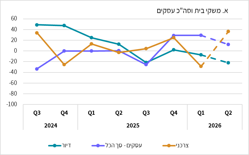 הממצאים המתפרסמים כאן מצרפיים ומתייחסים לכלל התאגידים הבנקאיים. הם מיוצגים באמצעות מאזני נטו משוקללים[1], המסכמים את השינוי שחל ברביע הראשון של 2026 לעומת הרביע הקודם והשינוי הצפוי ברביע השני של 2026 לעומת הרביע הראשון של 2026. חשוב לציין שנתוני הסקר לרביע הראשון של 2026 משקפים את ההתפתחויות שהיו בשגרה ללא ההשפעות שעלולות להיות למבצע "שאגת הארי", שהחל בחודש מרץ.