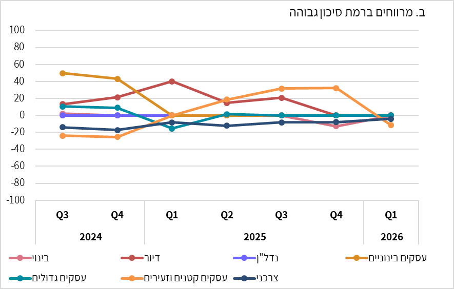 - ברביע הראשון של 2026 נמשכה ההקלה במרווחי האשראי ברמת סיכון לא גבוהה בכל המגזרים, ובמרווחי האשראי ברמת סיכון גבוהה לא דווח על שינוי בכל המגזרים מלבד אשראי לעסקים קטנים שלגביו דווח על הקשחה מסוימת.