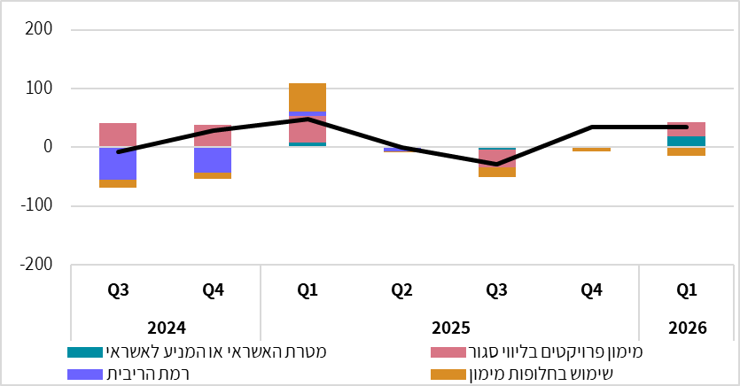 מבחינת ההשפעה של גורמים שונים על הביקוש לאשראי נראה שמימון פרוייקטים בליווי סגור היה הגורם לגידול בביקוש לאשראי לענף הבינוי ברביע הראשון של 2026 (תרשים 2). מהדיווחים של הבנקים התברר גם שצמצום ההוצאה על מוצרים בני קיימא היווה גורם לירידה בביקוש לאשראי צרכני.