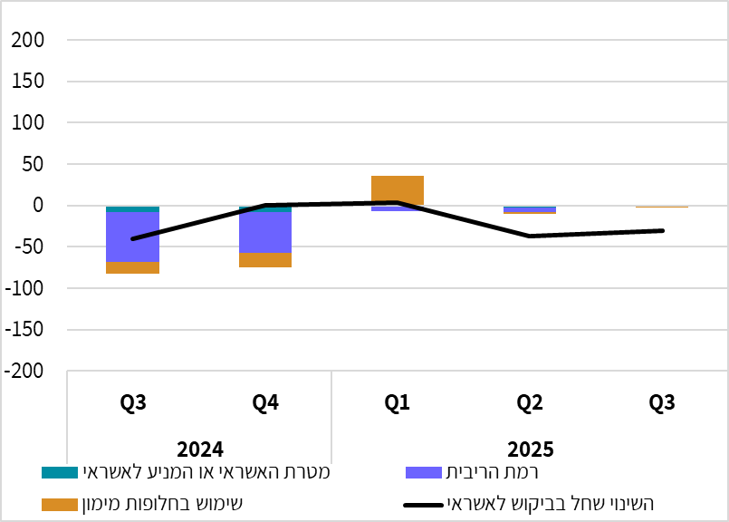 - ברביע השלישי של 2025 חלה ירידה מסוימת בביקוש לאשראי לדיור, והצפי הוא לגידול בו ברביע הבא.