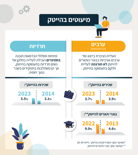 - שיעור הנשים החרדיות המועסקות במגזר ההייטק עלה בעשור האחרון ואף מתקרב לחלקן היחסי באוכלוסייה. זאת על רקע פתיחת מסלולי הנדסאות תוכנה לא אקדמיים בפיקוח המכון הממשלתי להכשרה טכנולוגית (מה"ט) בסמינרים של רשת 'בית יעקב', שסייעו להשתלבות נשים חרדיות צעירות בתעסוקה בהיי-טק. שכרן, עם זאת, נמוך יחסית לשכר יתר העובדים במשלחי יד טכנולוגיים במגזר ההייטק.