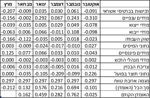 * הלוח מציג את התרומה של כל קבוצת רכיבים למדד החודשי, כך שהאומדן החודשי מהווה סכום של תרומת כל אחד מהרכיבים המפורטים בלוח. חלק מהנתונים הגולמיים משפיעים על האומדן החודשי בפיגור או על אומדני כמה חודשים.