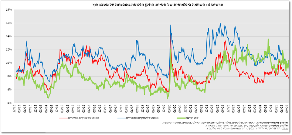 סטיית התקן הגלומה באופציות על שער החליפין שקל/דולר 'מעבר לדלפק' – המציינת את התנודתיות הצפויה בשער החליפין – ירדה ב-0.5 נקודות אחוז לרמה ממוצעת של 9.3%. זאת לצד רמתה הממוצעת של סטיית התקן הגלומה באופציות על מט"ח בשווקים מתעוררים שירדה ב-1.5 נקודות אחוז ועמדה בסוף הרביע על 9.6%.