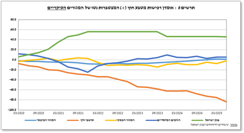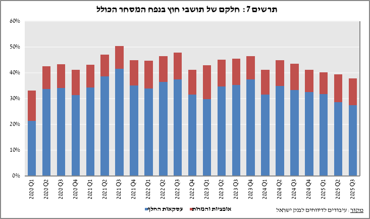תושבי חוץ המשיכו למכור מט"ח, אך בהיקף נמוך יותר: כ־4.9 מיליארד דולר ברבעון השלישי, לעומת כ־8.9 מיליארד דולר ברבעון הקודם.