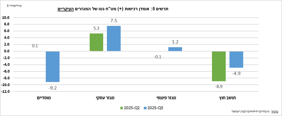 המגזר העסקי בלט בצד הרכישות, עם גידול משמעותי להיקף של כ־7.5 מיליארד דולר, בעיקר בשל עלייה ברכישות נטו של חברות יבוא ומכירות מתונות יותר מצד חברות יצוא בהשוואה לרבעון הקודם.