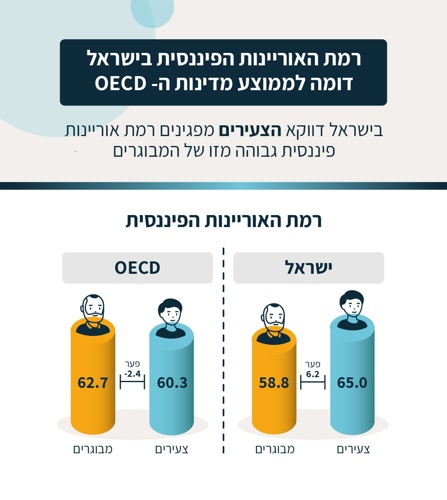 - הפערים המגדריים והבין-גיליים בישראל גדולים יחסית לממוצע ה-OECD. עם זאת, בניגוד למגמה העולמית, בישראל דווקא הצעירים מפגינים רמת אוריינות פיננסית גבוהה מזו של המבוגרים, תופעה המעידה על שינוי דורי בדפוסי האוריינות הפיננסית והידע.
