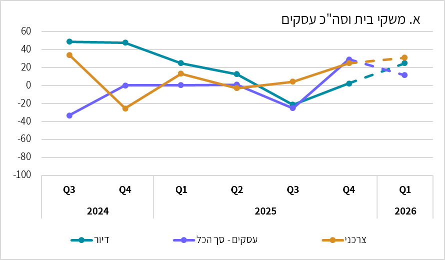 في الربع الأخير من عام 2025، شهد الطلب على الائتمان الاستهلاكي من الأسر ارتفاعاً، بينما لم يطرأ أي تغيير على الطلب على الائتمان السكني. في قطاع الأعمال، استمر الطلب على الائتمان من المصالح التجارية الصغيرة والمتوسطة في الازدياد؛ كما ازداد الطلب على الائتمان في قطاع الإنشاءات، واستقر في قطاع العقارات[2]. تتوقع البنوك زيادة في الطلب على الائتمان السكني والاستهلاكي من الأسر. أما في قطاع الأعمال، فتتوقع البنوك زيادة في الطلب على الائتمان التجاري للمصالح التجارية من جميع الأحجام، واستقراراً في قطاعي الإنشاءات والعقارات. (الشكل 1).