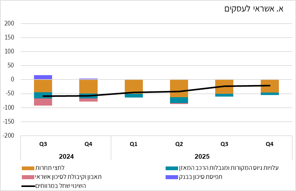 - في الربع الأخير من عام 2025، استمر تشديد هوامش الائتمان ذات مستويات المخاطر العالية للمصالح التجارية الصغيرة والمتوسطة، وكذلك ذات مستويات المخاطر المنخفضة لقطاع الإسكان. في الوقت نفسه، استمرت المرونة في شروط الائتمان في القطاعات الأخرى، والتي تجلّت بشكل أساسي في هوامش الائتمان ذات مستويات المخاطر المنخفضة.