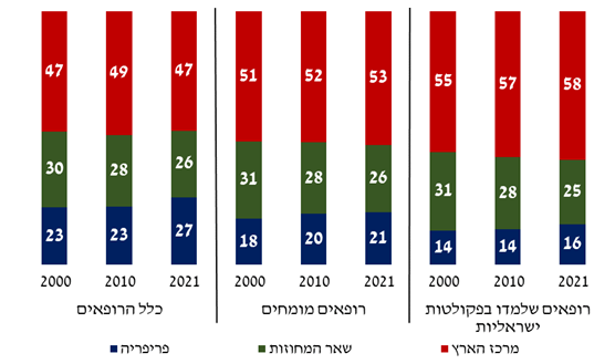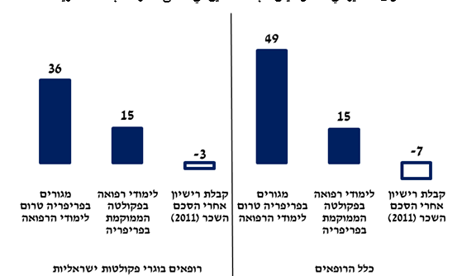 يعتبر عدد الأطباء في منطقة جغرافية ما شرطاً ضرورياً (لكنه غير كاف) لتوفير خدمات صحية مناسبة لسكان المنطقة. في إسرائيل، كما هو الحال في العديد من الدول الأخرى، يختلف التوزيع الجغرافي للأطباء عن توزيع السكان، وعلى وجه الخصوص، النسبة بين عدد الأطباء وعدد السكان، وجودة تأهيل الأطباء في مناطق الأطراف أقل مما هو عليه في منطقة المركز. تنعكس الفوارق في الجودة على سبيل المثال، في المعدل المنخفض نسبياً للأطباء المتخصصين والأطباء الذين تخرجوا من الكليات الإسرائيلية مقارنة بحجم السكان في مناطق الأطراف (الشكل 1). من أجل معالجة هذه الفوارق، تضمنت اتفاقية الأجور الموقعة مع الأطباء عام 2011 عدة حوافز لتشجيع الأطباء على الانتقال إلى مناطق الأطراف. بالإضافة إلى ذلك، تضمنت الاتفاقية حوافز لتشجيع الأطباء على التخصص في المجالات النادرة، أي التخصصات التي يوجد نقص في المتخصصين فيها (مثل الطب النفسي والتخدير وطب الشيخوخة).