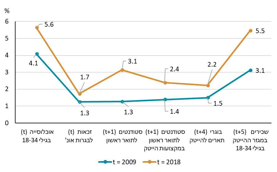 ملاحظات: يُمثل الحرف "t" السنة التي بدأت فيها المجموعة قيد الدراسة مسار الاندماج في التكنولوجيا الفائقة. في مرحلة الالتحاق بالجامعة، يتم فحص تمثيل العرب بين جميع طلاب الصف الثاني عشر في تلك السنة الأولية (t)، وكذلك تمثيلهم بين جميع الشباب (من 18 إلى 34 عاماً). يُفحص التمثيل في المرحلة الجامعية الأولى في السنة التي تلي انهاء الدراسة الثانوية (t+1)، بافتراض عدم التحاق هذه المجموعة بالجيش. يُفحص التمثيل في مرحلة أنهاء شهادة التكنولوجيا الفائقة بعد ثلاث سنوات من بدء الدراسة (t+4)، وأخيراً، يُفحص التمثيل في سوق العمل في السنة التي تلي التخرج (t+5). للاطلاع على تعريف قطاع التكنولوجيا الفائقة، انظر الملاحظة الهامشية رقم 2. المصدر: لوحة معلومات وزارة العمل "الأكاديميون من مختلف الفئات السكانية في مجال التكنولوجيا الفائقة"، والبيانات الإحصائية واستطلاعات اليد العاملة التي أجرتها دائرة الإحصاء المركزية، وتحليلات الباحثين. |