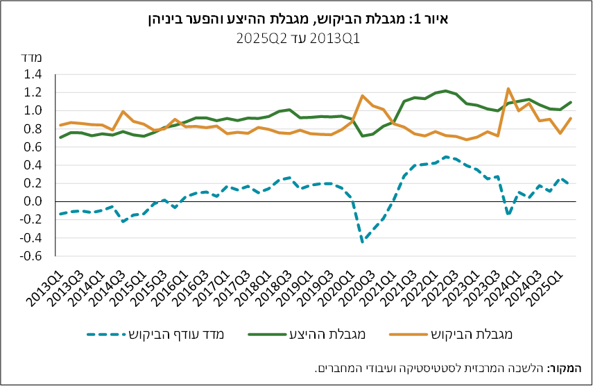 تُقدم دراسة جديدة أجراها الدكتور أليكس إيلك والدكتور يوفال مزار من شعبة الأبحاث، طريقةً جديدةً وبسيطةً لتقييم فائض الطلب في قطاع الأعمال في الوقت الحقيقي. تعتمد هذه الطريقة على بياناتٍ مُستمدة من مسح تقييم اتجاهات الأعمال الذي تجريه دائرة الإحصاء المركزية، والذي يتضمن تقاريرَ الشركات حول القيود الرئيسية التي تُعيق ممارسة أنشطتها. يُحسب فائض الطلب في قطاع الأعمال على أنه الفجوة بين المتوسط المرجح للقيود التي تعكس صعوبات العرض، وخاصةً نقص العمال، والقيود التي تعكس ضعف الطلب (الشكل 1).