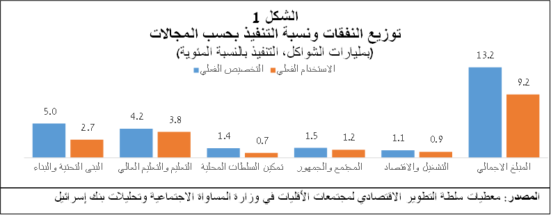 في الخطة الخمسية 992 التي تم تنفيذها فعلياً في الأعوام 2016-2021، خُصصت ميزانيات بنحو 13 مليار شيكل (بما في ذلك الموازنة التفاضلية)، حيث تم حتى تشرين الثاني 2021 استخدام حوالي 70% من ميزانيات الخطة. وقد تم تخصيص الجزء الأكبر من الميزانية لمجالات التعليم والبنية التحتية والبناء، والتي شكلت حوالي 70% من مخصصات الميزانية في الخطة (الشكل أ). في مجال التعليم كانت نسبة الاستغلال مرتفعة جداً وبلغت حوالي 90%، أما في مجال البنية التحتية والبناء فقد بلغت نسبة الاستخدام حوالي 50%.