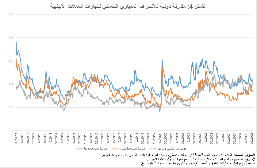 انخفض الانحراف المعياري الضمني لخيارات سعر صرف الشيكل/الدولار خارج البورصة - الذي يُشير إلى التقلب المتوقع في سعر الصرف - بمقدار 0.5 نقطة مئوية ليصل إلى متوسط 9.3%. يُضاف هذا إلى متوسط مستوى الانحراف المعياري الضمني لخيارات الصرف الأجنبي في الأسواق الناشئة، والذي انخفض بمقدار 1.5 نقطة مئوية ليصل إلى 9.6% بنهاية الربع.