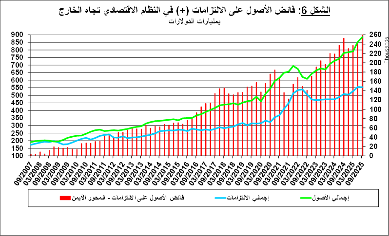 أدى الارتفاع الأكبر في رصيد الأصول مقارنة بالزيادة في رصيد الالتزامات إلى زيادة قدرها حوالي 16 مليار دولار (7٪) في فائض الأصول على الالتزامات تجاه الخارج، والذي بلغ في نهاية أيلول حوالي 260 مليار دولار (الشكل 6).