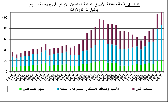 • ارتفعت قيمة محفظة الأوراق المالية خلال الربع الثالث بنحو 6.4 مليار دولار (حوالي 2.5%). يعود هذا الارتفاع بشكل رئيسي إلى زيادة أسعار الأوراق المالية الإسرائيلية المملوكة لغير المقيمين، والتي بلغت حوالي 6.4 مليار دولار. وقد استثمر غير المقيمين صافي استثمارات في الأسهم الإسرائيلية بحجم مليار دولار تقريباً، وحققوا صافي أرباح من السندات الإسرائيلية بلغ حوالي 2.5 مليار دولار.