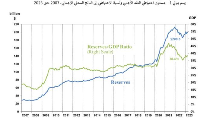 بلغ إجمالي احتياطي النقد الأجنبي 200،490 مليون دولار في نهاية شهر آذار 2023، وهو ارتفاع بحجم 4211 مليون دولار مقارنةً بنهاية الشهر السابق. وبلغ مستوى الاحتياطي نسبةً إلى الناتج المحلي الإجمالي 38.4 في المائة (الرسم البياني 1).