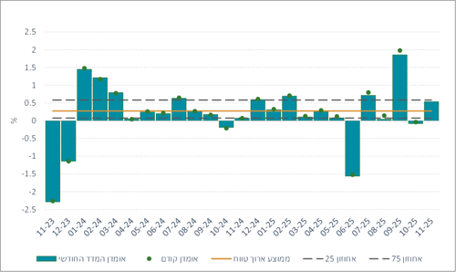 ارتفع المؤشر الشهري للنشاط الاقتصادي[1] في شهر تشرين الثاني بنسبة 0.5%، بعد انخفاض طفيف في الشهر السابق. يعكس هذا المؤشر متوسط تقديرات النمو الشهري للأشهر الثلاثة من أيلول إلى تشرين الثاني. وقد تأثر المؤشر إيجاباً ببيانات تصدير السلع بين أيلول وتشرين ثاني، وبيانات استيراد السلع الاستهلاكية ومدخلات الإنتاج في تشرين ثاني، وبيانات سوق العمل المتعلقة بعدد الموظفين والأجور والوظائف الشاغرة في أيلول وتشرين أول، وبيانات الضرائب غير المباشرة في تشرين أول وتشرين ثاني، ومؤشر بورصة تل أبيب ومؤشر ناسداك في أيلول وحتى تشرين ثاني. كما ساهم التقدير الثاني للناتج المحلي الإجمالي الفعلي للربع الثالث من العام، والذي نُشر هذا الأسبوع، في ارتفاع المؤشر. في المقابل، ساهمت بيانات الإيرادات لقطاعي التجارة والخدمات في شهر آب، وبيانات الإنتاج الصناعي للتكنولوجيا المختلطة عالية التقنية ومدخلات البناء، وبيانات استهلاك البنزين في أيلول، في الحد من ارتفاع المؤشر (الجداول 1 و2).