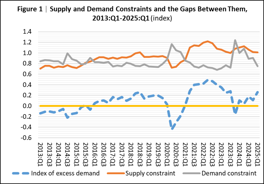 A key advantage of the current index is its ability to break down the sources of excess demand into changes in supply constraints and demand constraints. This breakdown allows for identifying the dominant factor affecting the economy at a given time. Accurate identification is crucial for setting monetary policy: when weak activity is due to demand constraints (weak demand), monetary expansion through interest rate cuts may help boost economic activity. Conversely, if the activity is hindered by supply constraints, lowering interest rates to boost demand is unlikely to help and may create demand pressures that lead to accelerated inflation.