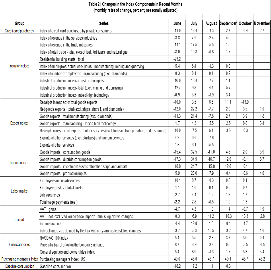 The monthly Index of Economic Activity[1] was increased by 0.5 percent in November, following a slight decline in October. The index this month reflects the average monthly growth estimate from September to November. The Index was positively influenced by data on goods exports in September to November, imports of consumption goods and production inputs in November, labor market data regarding the number of workers, wages, and job vacancies in September and October, indirect taxes in October and November, and the Tel Aviv Stock Exchange stock index and the Nasdaq index in September to November. The second estimate of actual GDP in the third quarter, which was published this week, also contributed to the increase in the index. In contrast, revenue data in the trade and services industries, industrial production data in mixed-high technology and in construction inputs, and gasoline consumption data in September moderated the increase in the index (Tables 1 and 2).