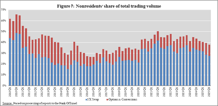 The estimated total activity in transactions against the shekel, as reflected in reports from the domestic banking system and foreign reporting entities, indicates that nonresidents’ relative share of trading volume in spot and forward transactions (excluding swaps and options) was about 86 percent in the third quarter.