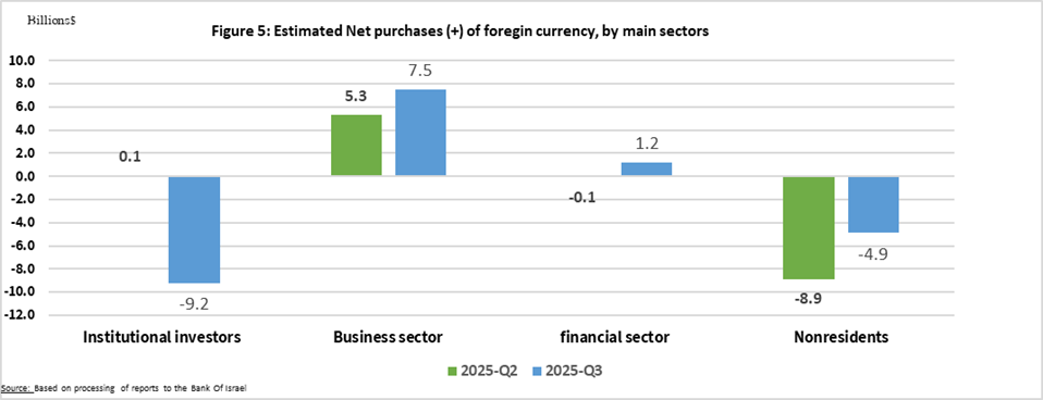 An estimate of activity by the main segments in the foreign exchange market indicates heterogeneous activity. In the third quarter, there were net foreign exchange sales by nonresidents and institutional investors, which supported the strengthening of the shekel, and foreign exchange purchases by the business sector. Institutional investors—pension funds, provident funds, and insurance companies—made a change in their activities. After moderate purchases in the previous quarter, totaling about $0.1 billion, they made net sales of foreign exchange totaling about $9.2 billion in the third quarter. Nonresidents continued to sell foreign exchange, but at a lower volume: about $4.9 billion in the third quarter, compared to about $8.9 billion in the second quarter. The business sector was prominent on the purchasing side, with a significant increase to about $7.5 billion, mainly due to an increase in net purchases by import firms and more moderate sales by export firms than in the previous quarter.