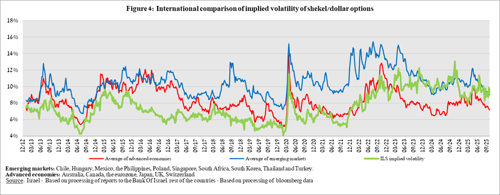The average implied volatility in over-the-counter shekel/dollar options which is an indication of expected exchange rate volatility, declined by 0.5 percentage points during the quarter, to an average level of about 9.3 percent at the end of the quarter.