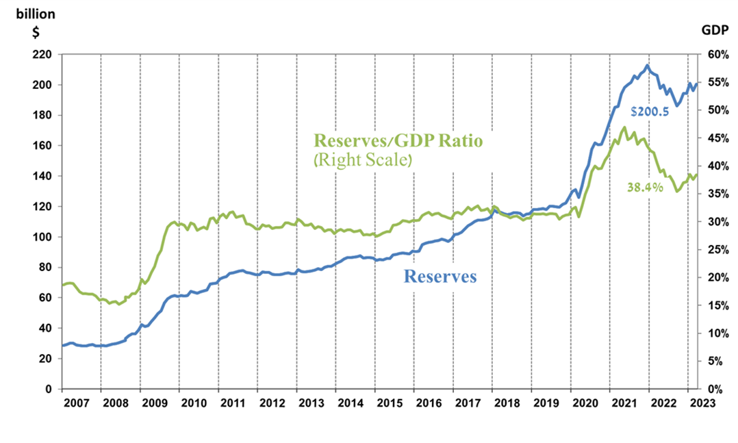 Level of foreign exchange reserves, and their ratio to GDP, 2007–23