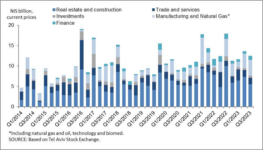 In October 2023, the business sector issued bonds worth about NIS 2 billion, lower than the monthly average in the third quarter (about NIS 4 billion, on average), in view of the Swords of Iron war. Companies from the real estate and construction industry accounted for about 73 percent of the bond issuances in October.