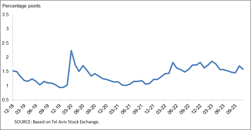 - The spread between the yields on corporate bonds included in the Tel Bond 60 index and the yields on indexed government bonds narrowed to about 1.45 percentage points. In October this spread widened slightly, for the first time since the beginning of the year, in view of the Swords of Iron war, while in November, the spread again narrowed to about 1.58 percentage points.