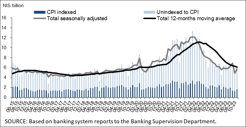 - In the third quarter of 2023, new mortgages taken out totaled about NIS 19 billion, significantly lower than in the corresponding quarter of the previous year (about NIS 27 billion). The slowdown in new mortgages continued, and they totaled about NIS 5 billion in October 2023, in view of the Swords of Iron war and seasonal adjustments—significantly lower than the monthly average of the previous three years (about NIS 8.6 billion). In November, there was a slight increase in mortgage borrowing, which totaled about NIS 6 billion seasonally adjusted, lower than in the parallel month last year (Figure 6).