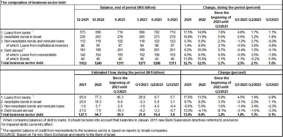 - In the third quarter of 2023, the balance of business sector debt continued to increase, by approximately NIS 12 billion (1 percent), to a level of about NIS 1.3 trillion. However, the slowdown in the balance’s year-over-year growth rate, which began in the second half of 2022, continued.